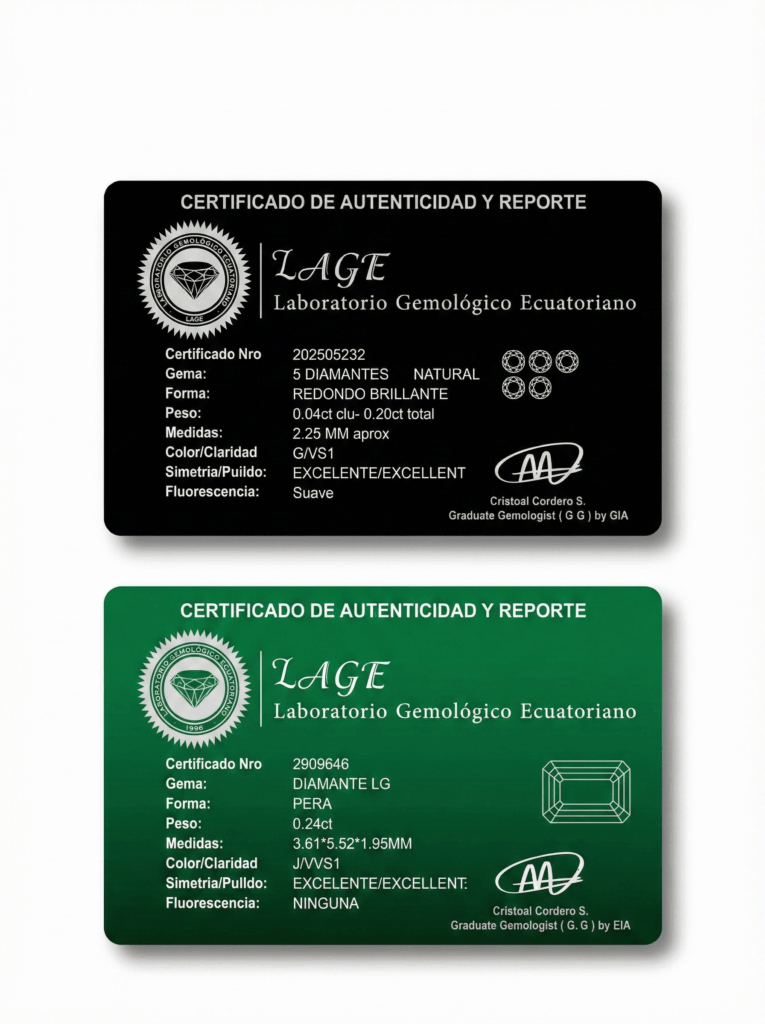 Nuestros diamantes se entregan con reportes emitidos por laboratorios reconocidos, como GIA, IGI o LAGE