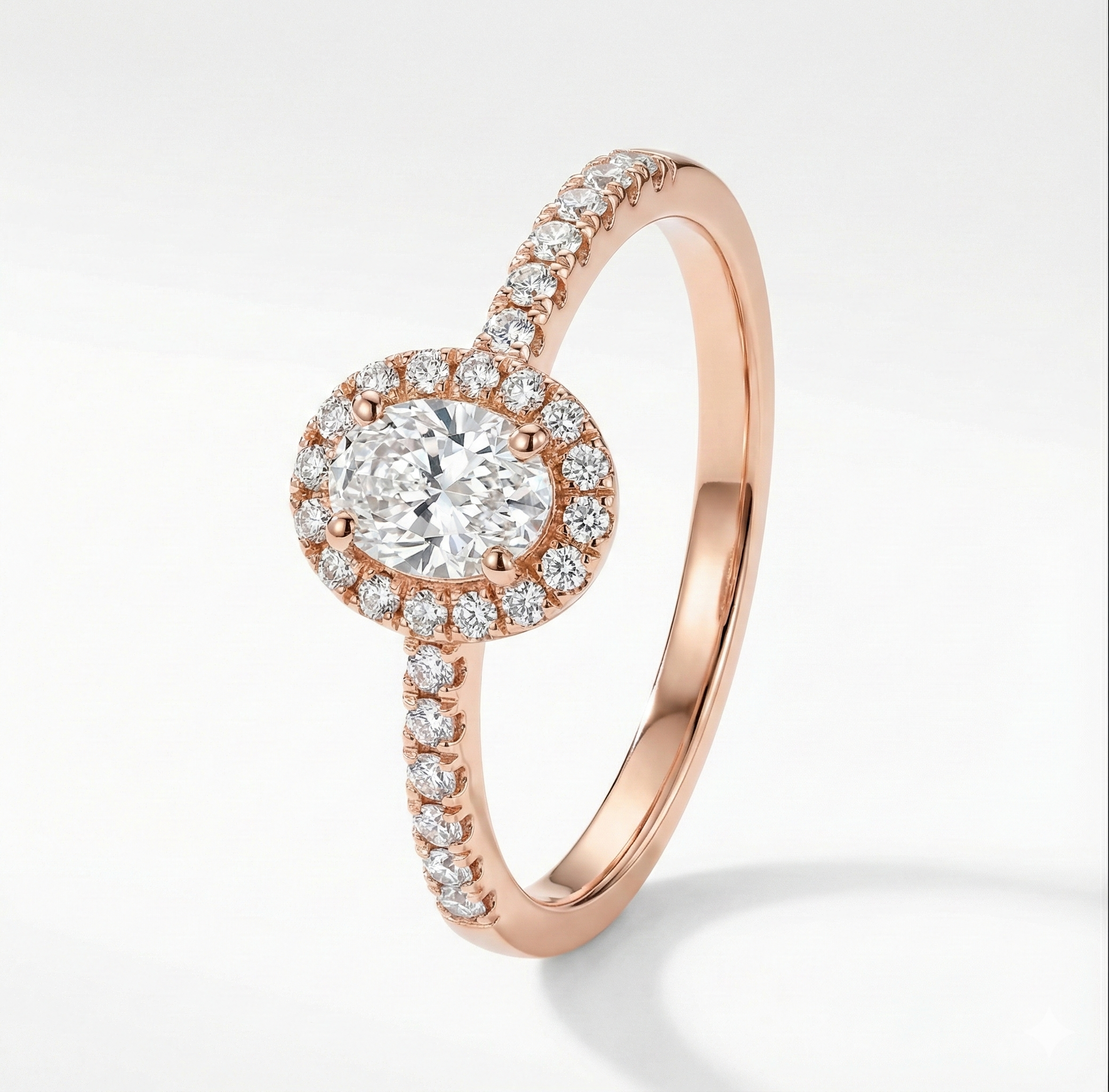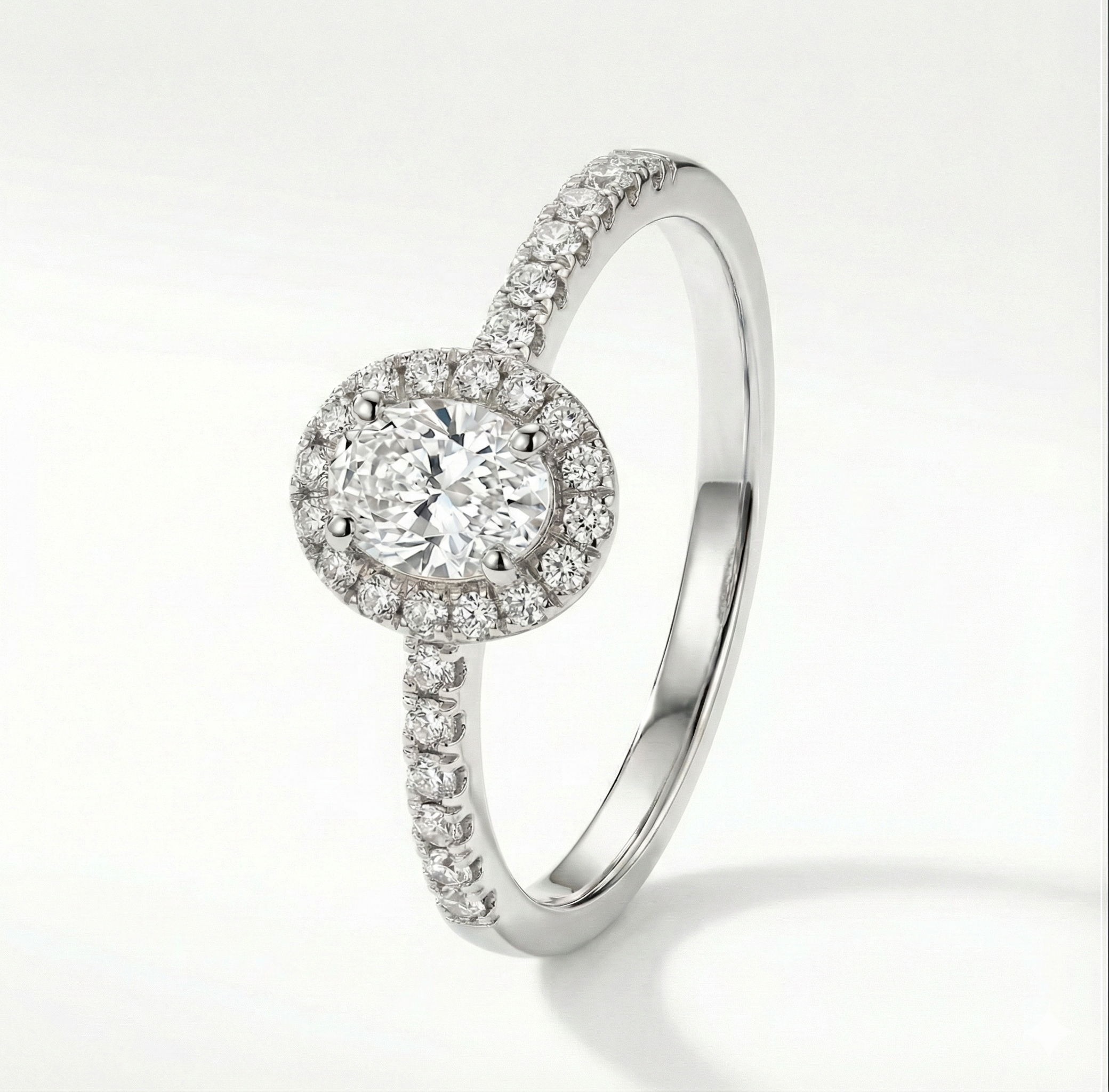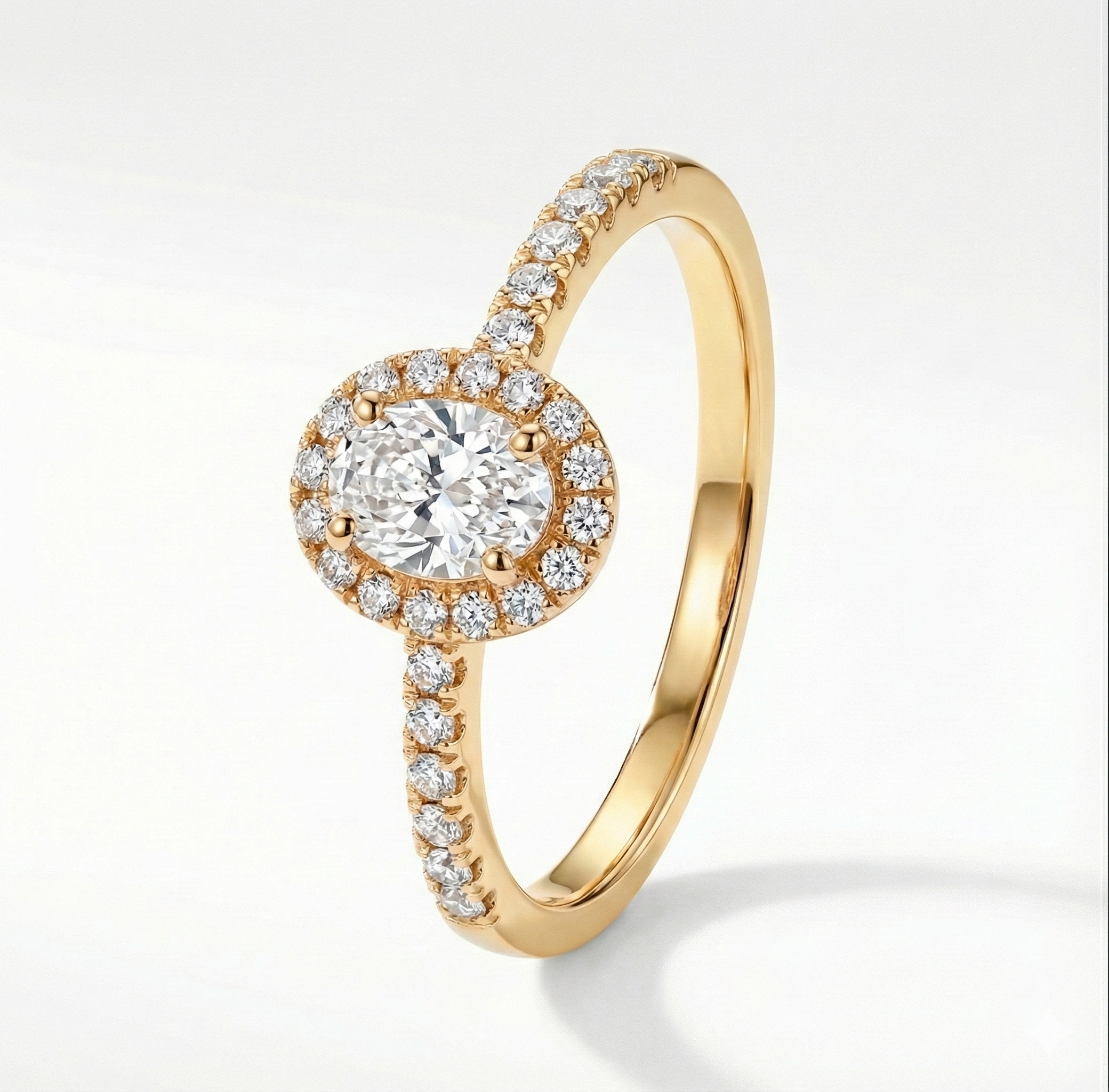 Anillo de compromiso en oro con un brillante central rodeado por un halo de diamantes y una banda engastada en pavé. Un diseño clásico y luminoso que maximiza el brillo desde cada ángulo.
