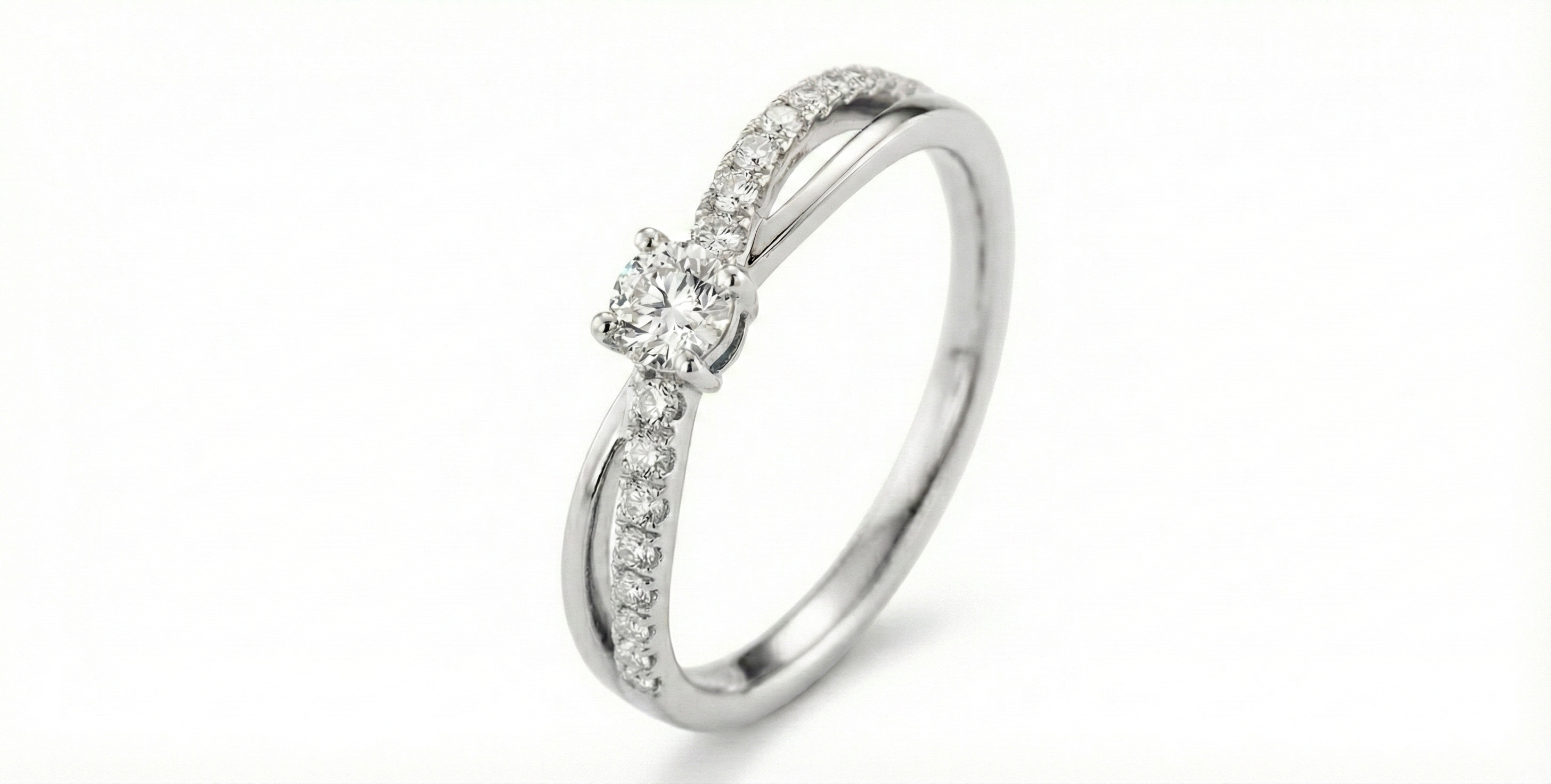 Hermoso Anillo de compromiso en oro de diseño cruzado, con un brillante central engastado en cuatro garras y una banda lateral adornada con diamantes talla redonda. Un diseño moderno y delicado que realza la luz desde cada ángulo.